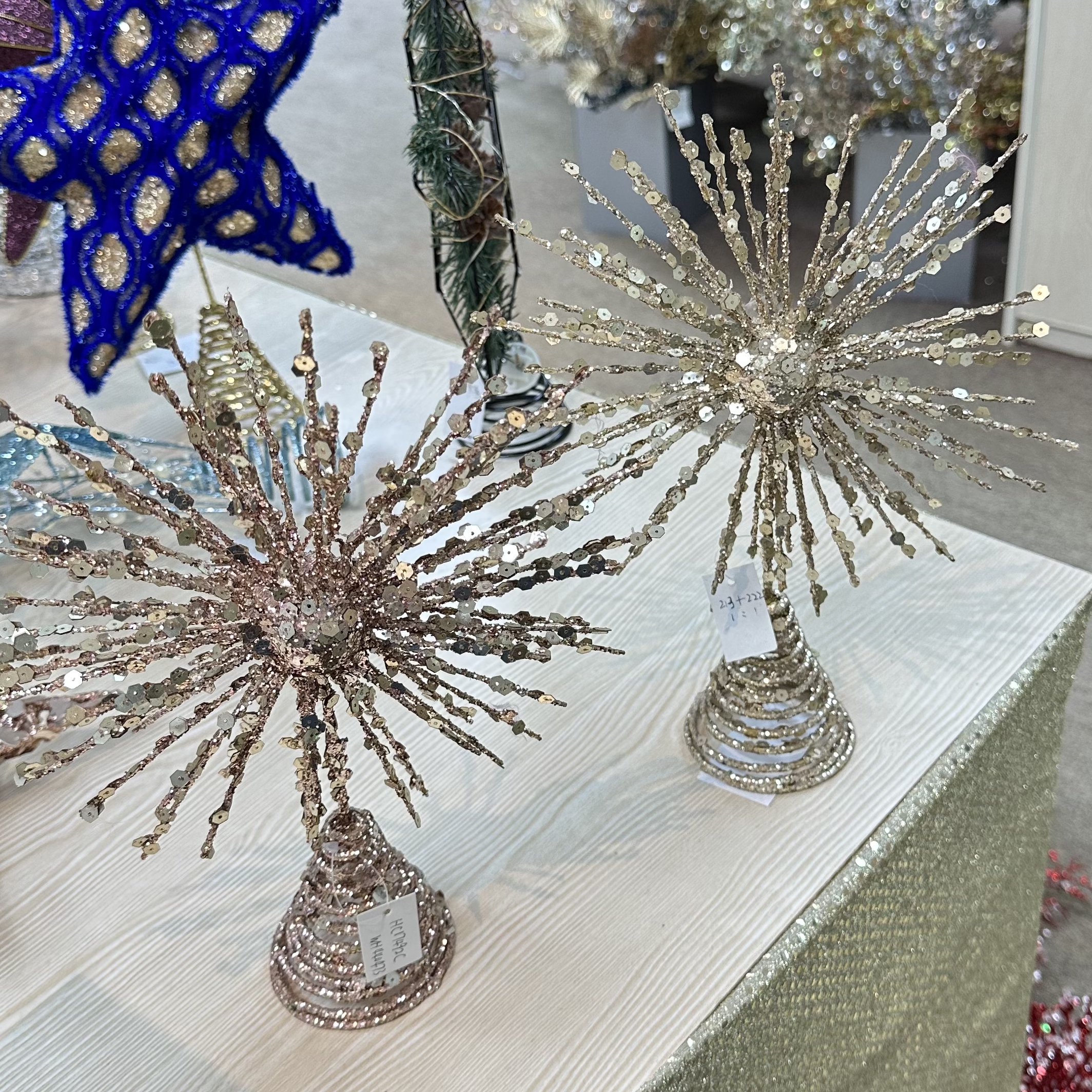 Elegant metallic Christmas tree topper stars with premium glitter finishes. Available in gold, silver, and champagne - perfect for upscale retail markets demanding sophisticated tree crowns.